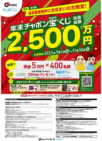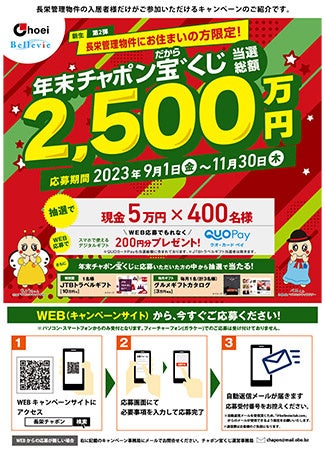 マンション管理会社の株式会社長栄(本社:京都市/代表取締役:長田 修)は、当選総額2,500万円をプレゼントする「年末チャポン宝゛(だから)くじ」の応募を2023年9月1日に開始しました。