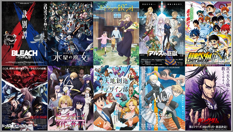 今回、旭プロダクションのブースで展示される作品には撮影、CG、特殊効果などで制作協力をした、現在絶賛放映中の人気タイトル『BLEACH 千年血戦篇-訣別譚-』、2クール目を終えたばかりの名作『機動戦士ガンダム 水星の魔女』、自転車スポーツドラマのアニメ『弱虫ペダル』、第5シリーズ2024年1月放送決定の戦国時代(中国)のアニメ『キングダム』の他、動物ファンタジーコメディ作品『天地創造デザイン部』、漫画家と流れ星の民の姫が展開するラブストーリー『おとなりに銀河』、SFファンタジーの『アルスの巨獣』、そして『WAVE‼』、『ドールズフロントライン』、『ピーチボーイリバーサイド』など制作をした10作品のポスター、PV、原画、設定集などを展示します。