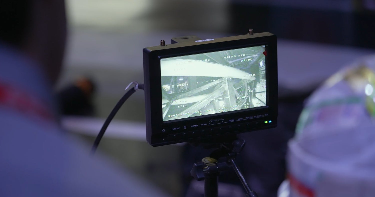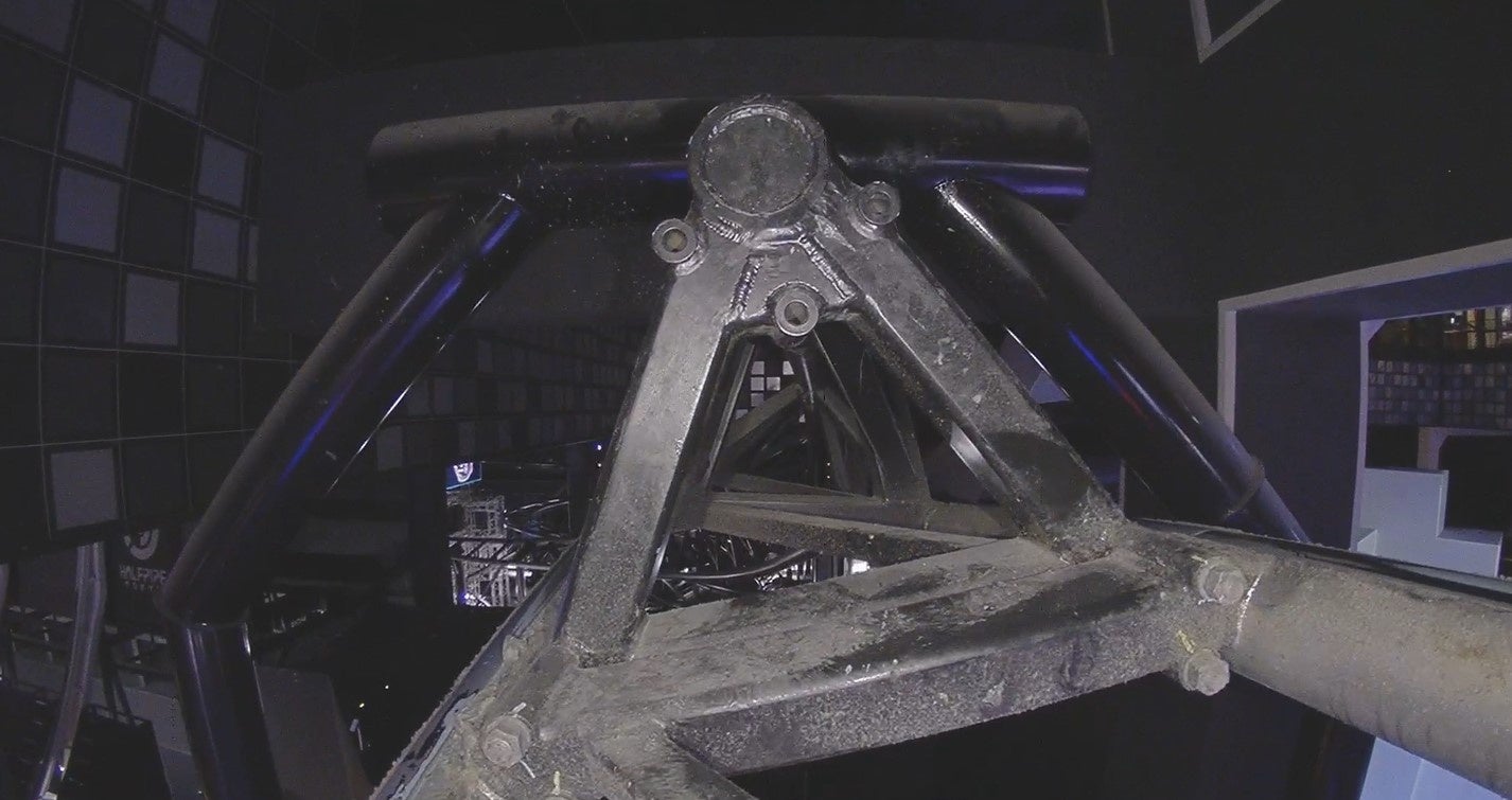 屋内で狭所、高所、暗所にあるレール全周を、ドローンが深く⼊り込み撮影する必要があった。そのため、Liberawareの狭⼩空間専⽤の点検ドローン「IBIS2」を採⽤した。点検箇所の、わずか数cmまで近づき撮影。実際の東京ジョイポリス保全担当者にも、操縦者の撮影映像をリアルタイムで確認頂き、ドローンが担当者の⽬となり、点検を実施した。