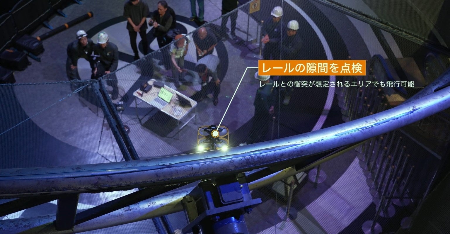 東京ジョイポリスでは、屋内ジェットコースターの高所かつ点検用⾜場がないレール溶接部などの点検は、アクセスができず、さらに地上からの目視点検では困難であるという課題があった。点検時には高額なコストをかけて足場を設置し点検をしていたが、以前より安全な点検方法の1つとしてドローンの活⽤を検討していた。