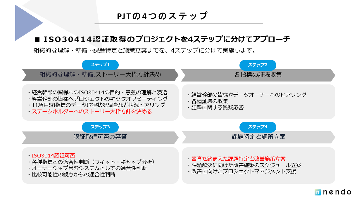 更に、ISO30414認証取得までを目指すのであれば、一例ではありますが下記のようなステップを区切ってアプローチしていきます。
