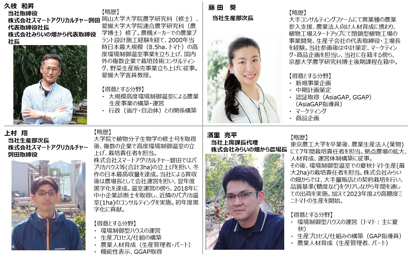 当社のコンサルティングチームは、大規模施設園芸の事業立ち上げ・運営経験が豊富なスペシャリストを筆頭に、果菜類の施設園芸生産事業の専門家、植物工場のスタートアップ経験者、大手コンサルティングファーム出身者など、施設園芸事業の参入・運営に伴走するレベルの高い人材が揃っております。