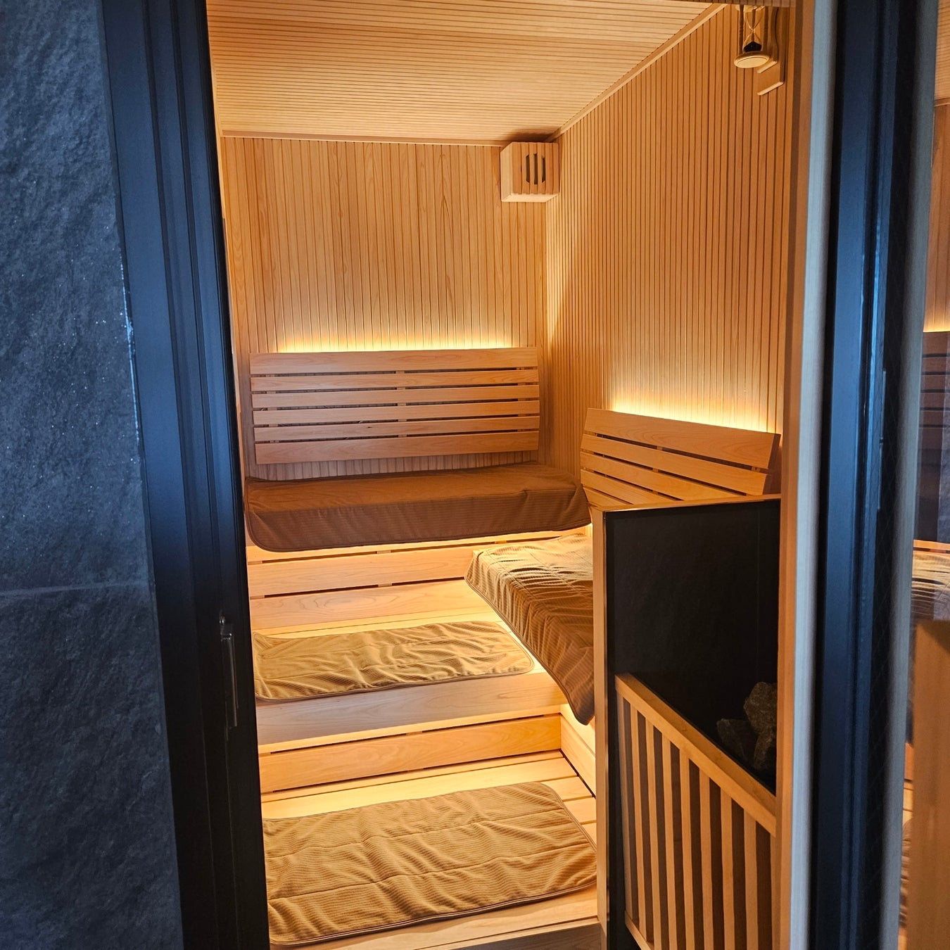 ご自身でロウリュウを行えるプライベート仕様のサウナ室を完備。水風呂、半露天の浴レイニーシャワーと合わせて、客室内で本格的なサウナ体験が可能です。