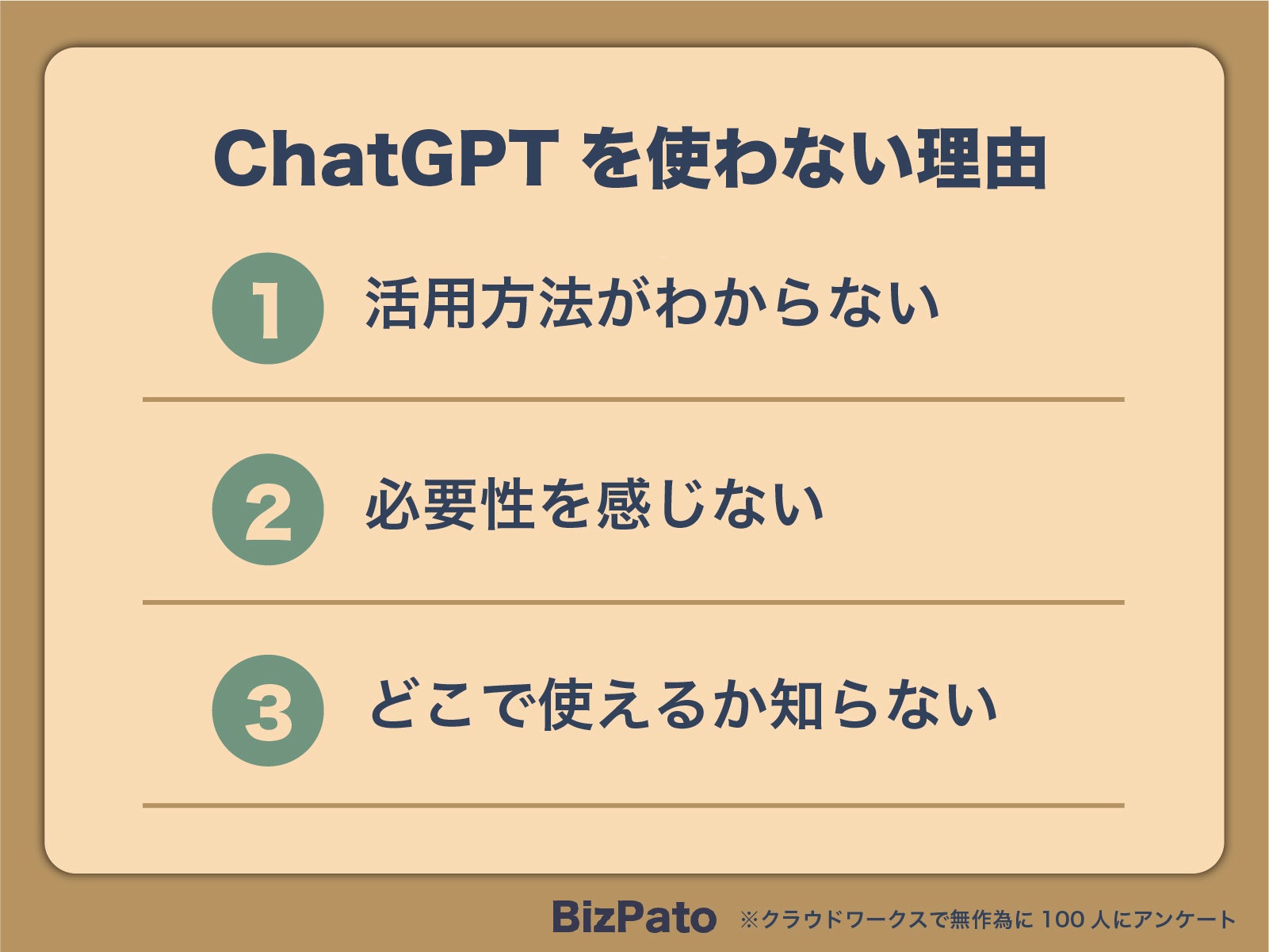 また、自由回答の項目には、「冷蔵庫の中にある食べ物を伝えて、レシピを教えてもらう」という料理の時短テクニックを使っている主婦の方もいました。うまく活用することで仕事だけでなく、家事さえも効率化できるChatGPTですが、まだ使ったことがないという方も多くいます。