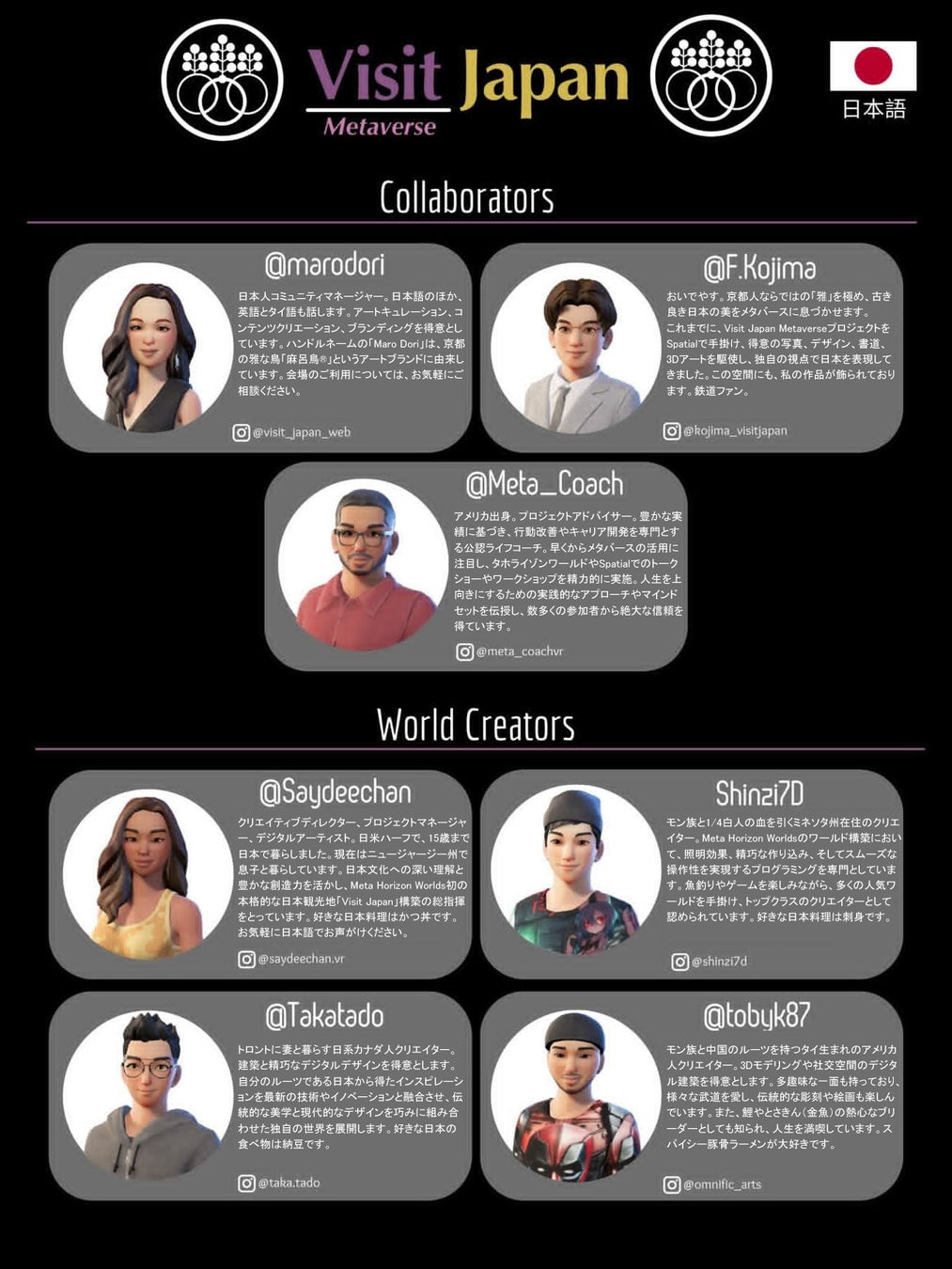 最近では、アバターの表現力が向上し、様々なソーシャル機能も充実しています。これにより、ユーザー体験がより楽しく、魅力的なものとなっています。このような背景の中で、これまで、国際的で多様性のあるSpatialで培った経験を基に、まるで実際に日本を訪れて観光しているかのような、リアリティのある上質な仮想体験を提供し、日本人と海外ユーザーの双方にとって心地よい時間を過ごしていただける優良ワールドの運営を通じ、訪日意欲の向上や日本文化への関心を高める場としたいと考えています。