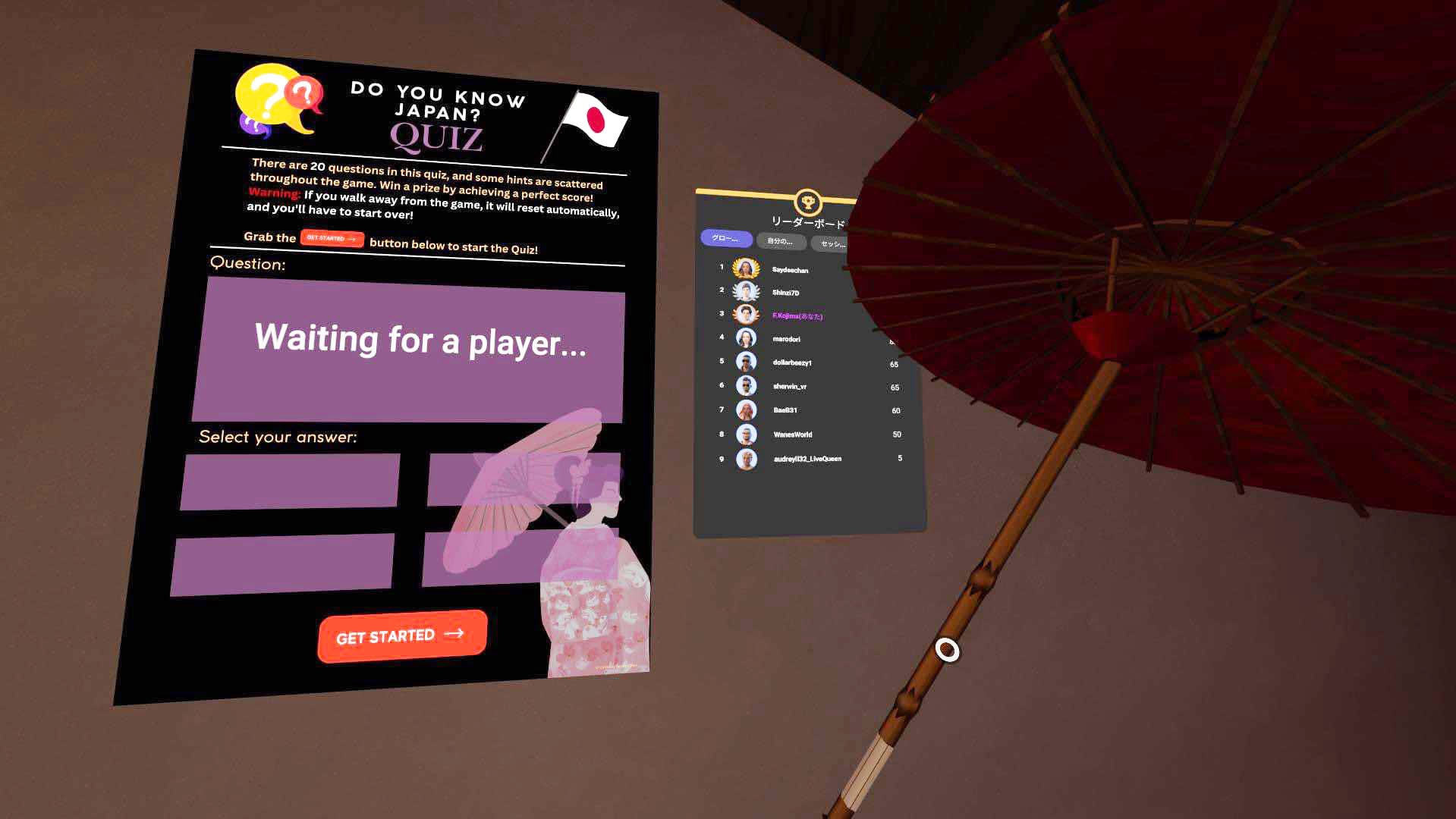 日本に関するクイズに正解すると和傘を獲得できる仕組みや、VRヘッドセットで撮影した写真を共有するスライド機能、カメラ機能付きの鏡、VR空間内で使える文字入力用のキーボードなど、ゲーミフィケーションやインタラクティブな工夫が豊富にあります。