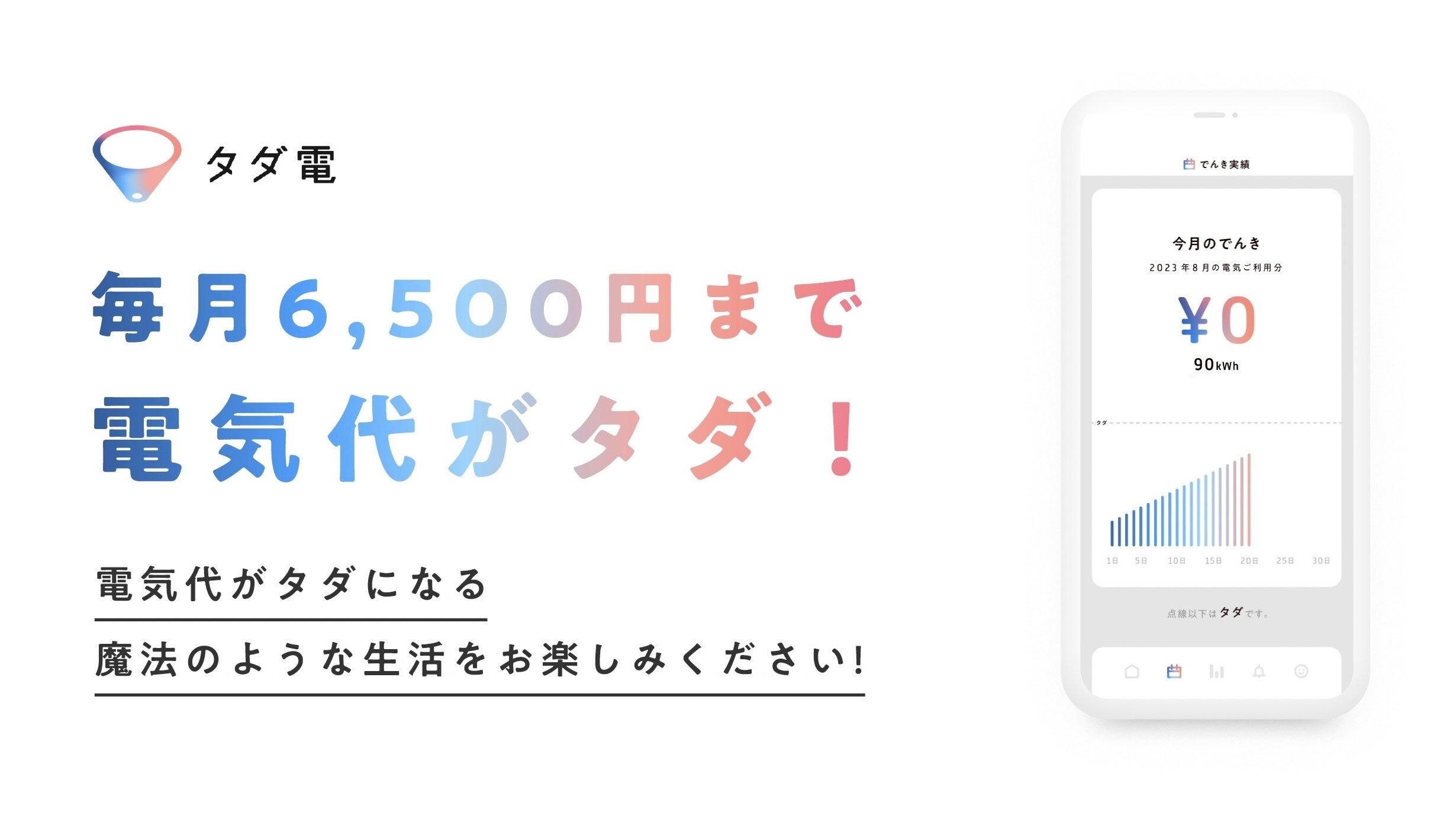 こうした中、昨今の物価高の影響もあり、近年、電気料金の異常な高騰が続いております。しかし電気は私たちの生活に不可欠で、電気代を削ることは難しくもあります。皆様に少しでも豊かな生活を送っていただけるお手伝いができないかという想いから、この度、毎月の自宅の電気代が6,500円までタダ(無料)になる電力会社『タダ電』の提供を開始することとなりました。