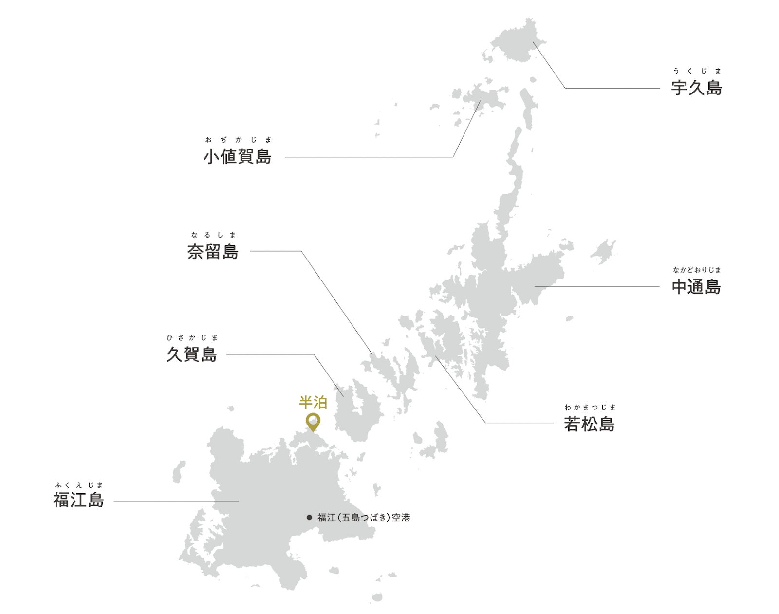 五島列島は九州最西端に浮かぶ、大小約150の島々からなる列島です。「めぐりめぐらす」のある五島列島最大の島・福江島には、列島で唯一の空港(五島つばき空港)があり、羽田から最短で3時間ほど。半泊地域は、空港から車で40分ほどの距離です。福江島には医療施設、スーパー、ATMなど生活に必要なインフラも揃っていて不便なく過ごせます。