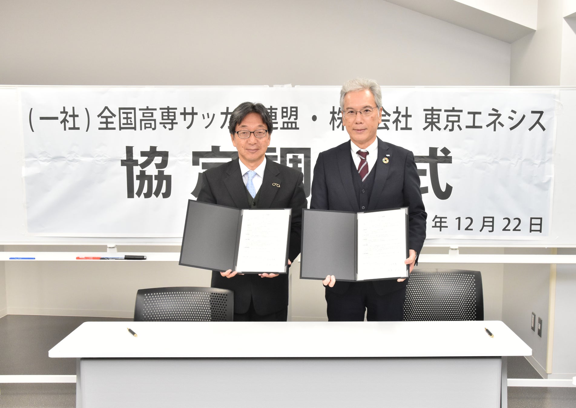 2023年12月22日、「第58回全国高等専門学校体育大会サッカー競技 兼 第56回全国高等専門学校サッカー選手権大会」が開催された栃木県宇都宮市総合運動公園内において、全国高等専門学校サッカー連盟の長水壽寛理事長と東京エネシスの眞島俊昭社長による協定調印式が行われました。
