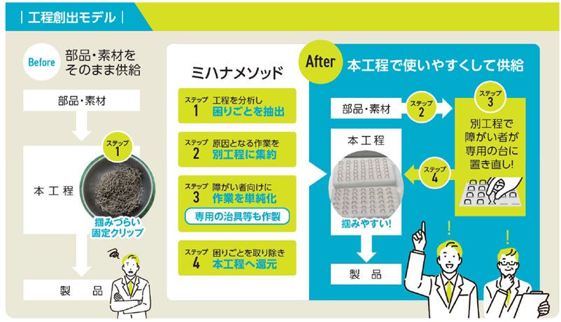 そこで今回、障がい者を貴重な人材の戦力として捉えている綜合キャリアトラストと、自動車製造での改善ノウハウを活かして製造工程での障がい者作業の創出を行う「ミハナ」が連携し、製造・物流関連企業向けサービス「ソーシャルワークス」の提供を開始いたします。