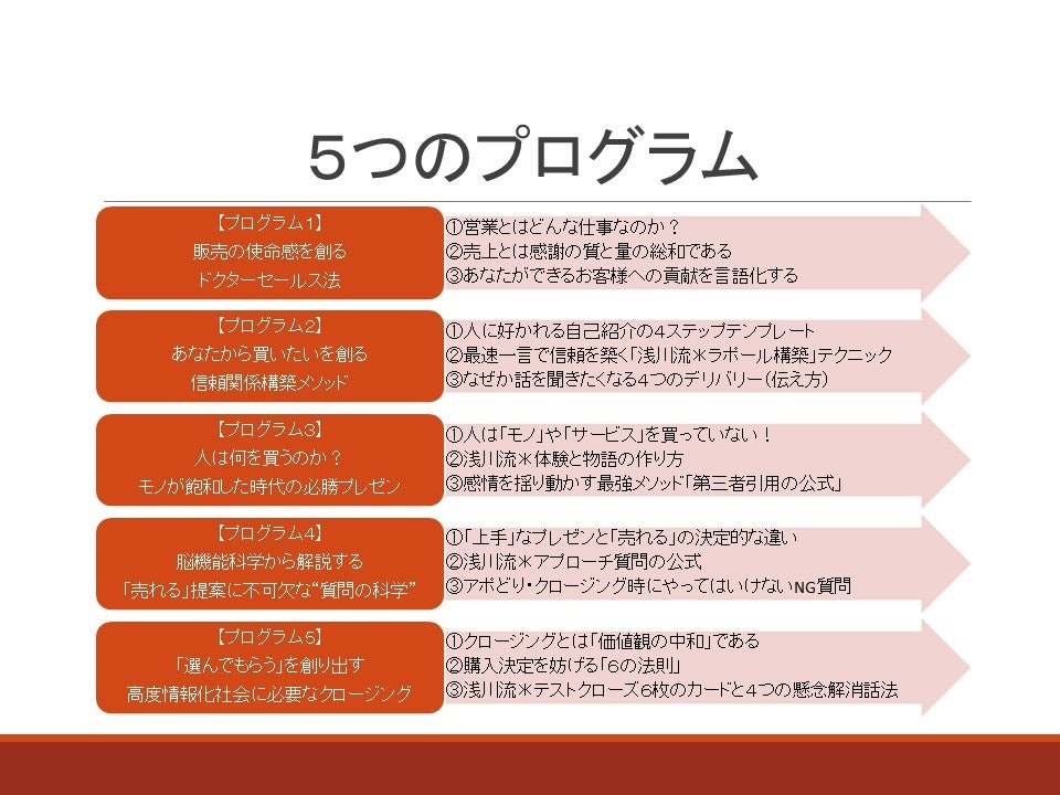 「信頼構築構築」「質問の科学」「モノが飽和した時代の提案」「高度情報化社会の2種類のクロージング」等、プレゼンテーションを10ステップで学習。コンテンツは行動心理学・脳科学の理論をベースに、誰でも成果を再現できるよう設計されています。