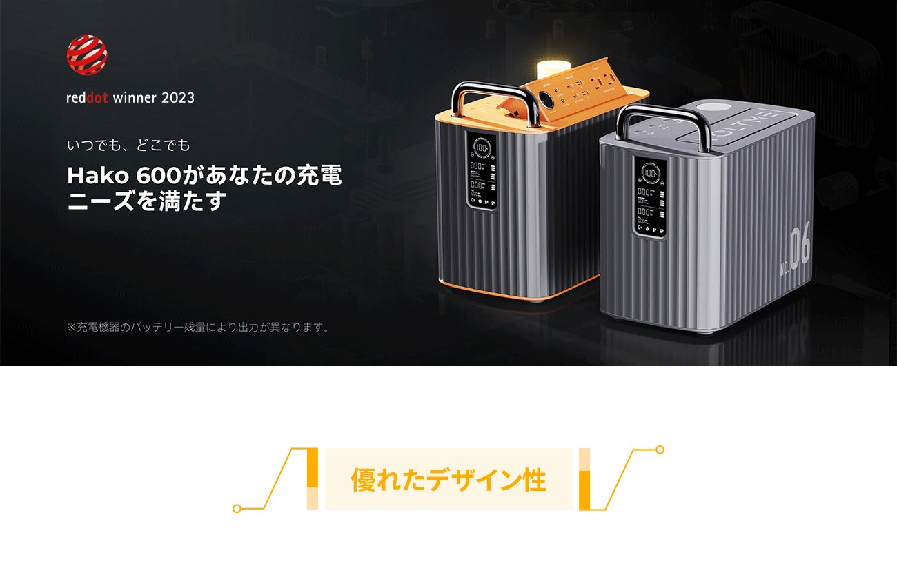VOLTME(ボルトミー)のHakoシリーズは従来のポータブル電源と違い、初代のパネル収納ポータブル電源です。Hakoシリーズは自社開発で複数のデザイン案を経って、独自冷却技術「Voltnado™」を採用して誕生しました。このシリーズは様々な状況に対応し、安定安心な放熱性があるデザインとなっております。それとともに「HelixDuo™ Dynamic」を採用して、超高速充電も実現されました。その革新的なデザインは国際的な専門家からも認められて、2023 Red Dot Awardを受賞しました。