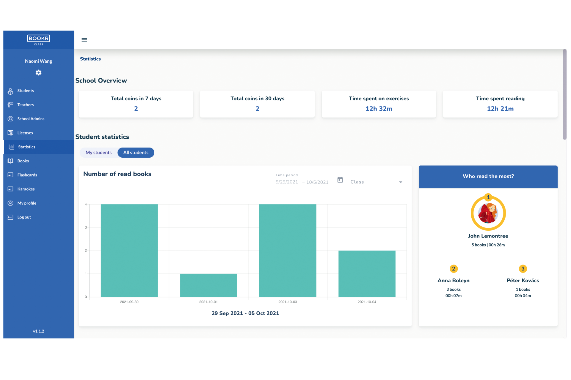 読書習慣、課題の完了度、レベルの進展、そして言語スキルの発達を追跡することが可能です。