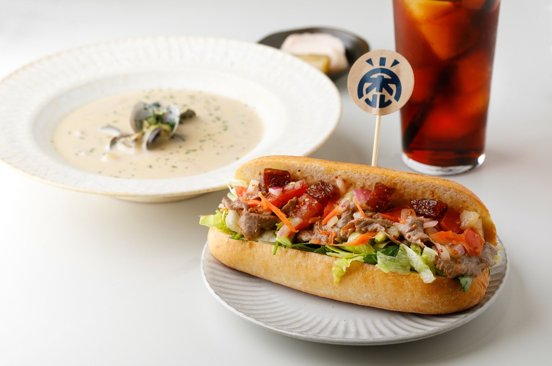 塩だけでシンプルに焼き上げたしまね和牛を、たっぷり野菜とともにソフトフランスでサンド。肉の旨みを引き立てる粒マスタードが味のアクセントに。宍道湖の大粒しじみが入った豆乳チャウダーと楽しむ、サンド&スープの満足セットです。 漬物、ドリンク付き。