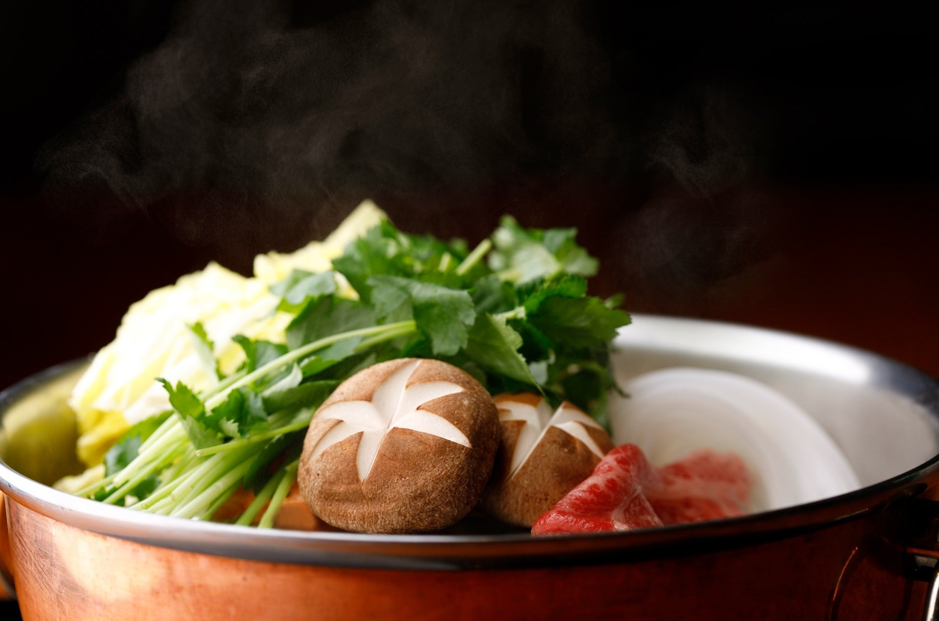 松阪牛のルーツともいわれる伊勢牛は、赤身と脂身のバランスがよく、きめ細かなサシであっさりとした味わいが魅力。看板メニューの「しゃぶしゃぶ」と「すき焼き」は、期間限定で島根県産の肉厚な椎茸を使用。食べ応えのある“かさ”を丸ごと楽しめます。