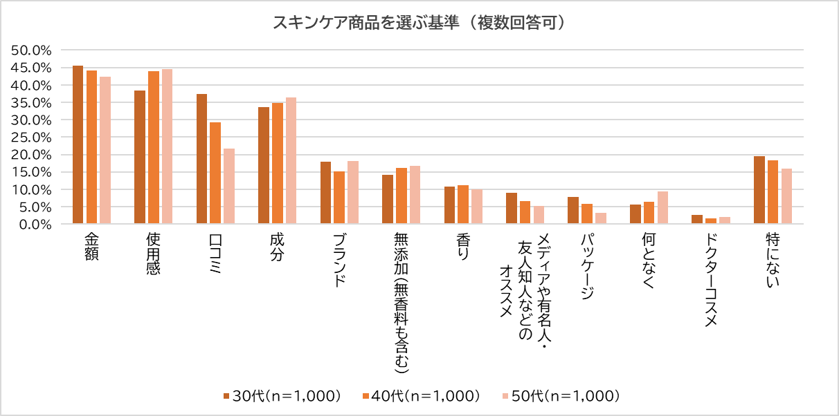 ・スキンケア商品選びの基準 どの年代も「金額」「使用感」が2トップ
