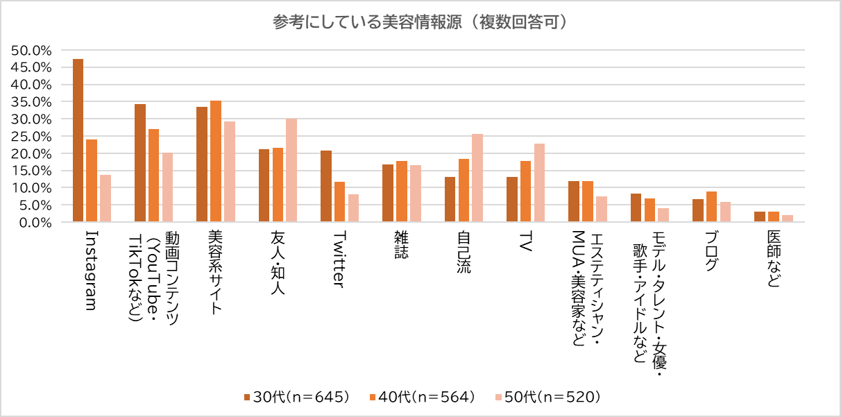 ・参考にしている美容情報源 30代は「Instagram」、40代は「美容系サイト」、50代は「友人・知人」がトップ