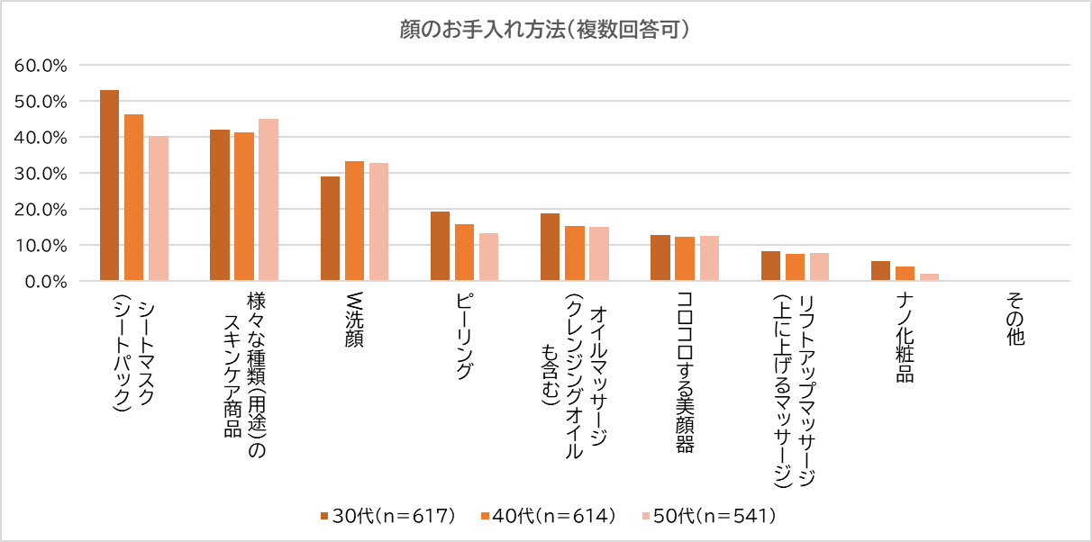 「はい」と回答した人に「どのようなお手入れをしているか?」尋ねました。30代・40代は「シートマスク(シートパック)」(30代:53.2%、40代:46.4%、50代:40.3%)、50代は「様々な種類(用途)のスキンケア商品」(30代:42.0%、40代:41.4%、50代:45.1%)が最多で、30・40代の次点は「様々な種類(用途)のスキンケア商品」、50代の次点は「シートマスク(シートパック)」、3位はどの年代も「W洗顔」(30代:29.0%、40代:33.4%、50代:32.9%)でした。