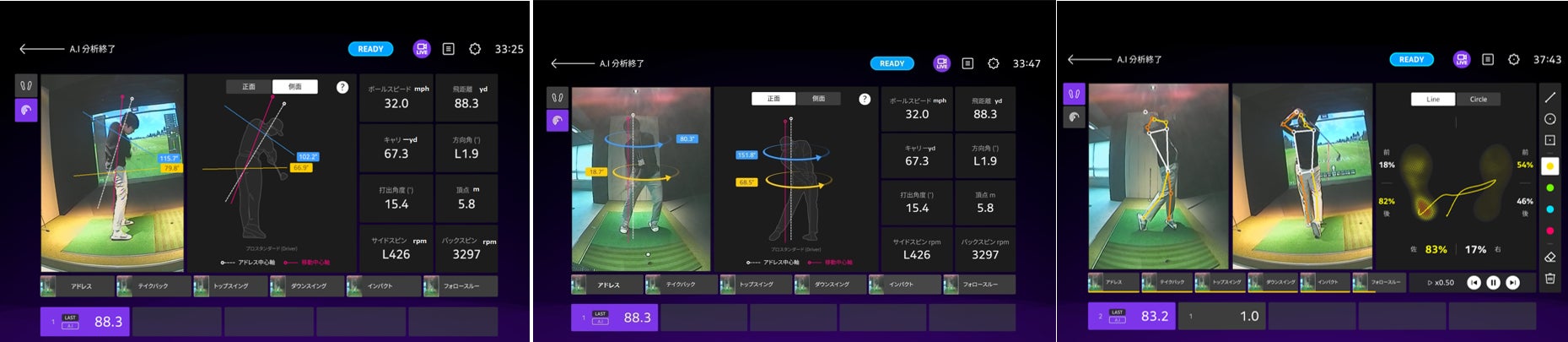 ゴルフの練習に最適なコンテンツを備え、集中したゴルフの練習ができます。クラブ測定モード、分析モード、AI分析モード、コーストレーニングモード、ジュニアトレーニングモード、大会及びイベントを搭載。特にAI分析機能は改善点のポイント確認に役立ちます。