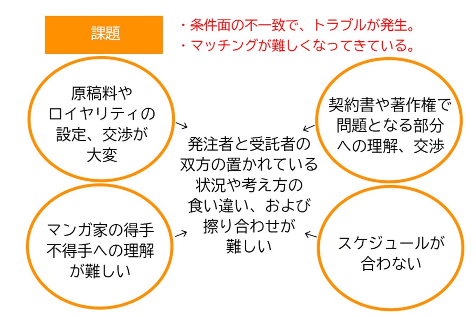 「原稿料やロイヤリティの設定、交渉」、「契約書や著作権で問題となる部分への理解、交渉」、「クライアント(発注者)とクリエイター(受託者)の双方の置かれている状況や考え方(マインド)の食い違い、および擦り合わせ」などでトラブルが多く発生します。さらに、マンガ家の得手不得手への理解、スケジュールとの兼ね合いで仕事をマッチングするのが難しくなってきています。弊社では多く参画したマンガ事業立ち上げの経験を元に、柔軟に対応していける方、かつベストな条件面を一緒に模索できるマンガ家の選定が行えます。条件面不一致による双方の負担を減らし、事業成長のお手伝いをさせていただきます。