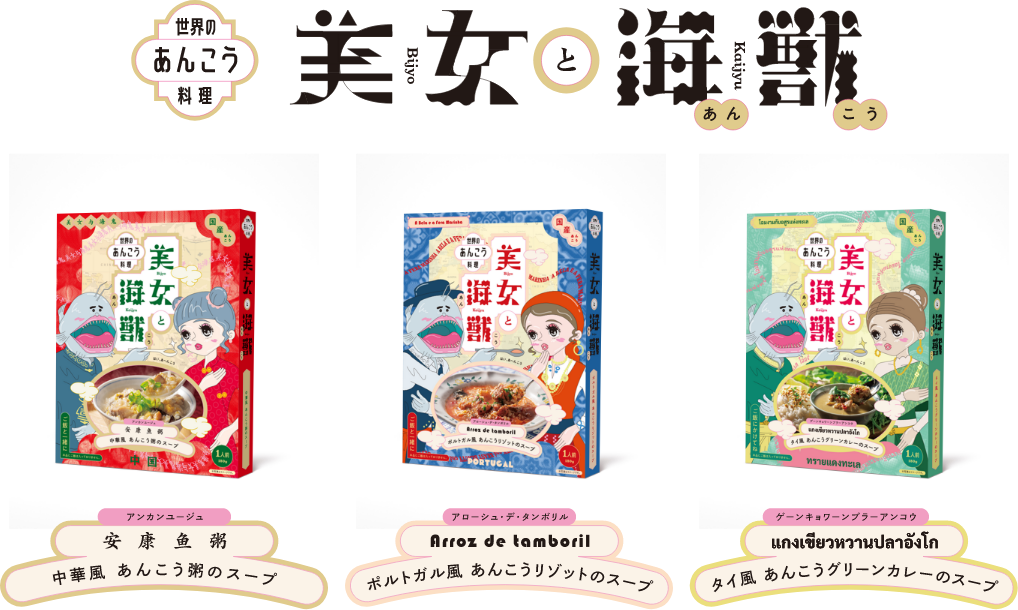 『美女と海獣』シリーズは「世界のあんこう料理」をおいしく手軽に楽しんでいただけるように、という想いから「浜田のあんこう」を使用し絶品スープに仕上げました。少し変わったあんこう料理を楽しんでみたい方へおすすめ商品です。