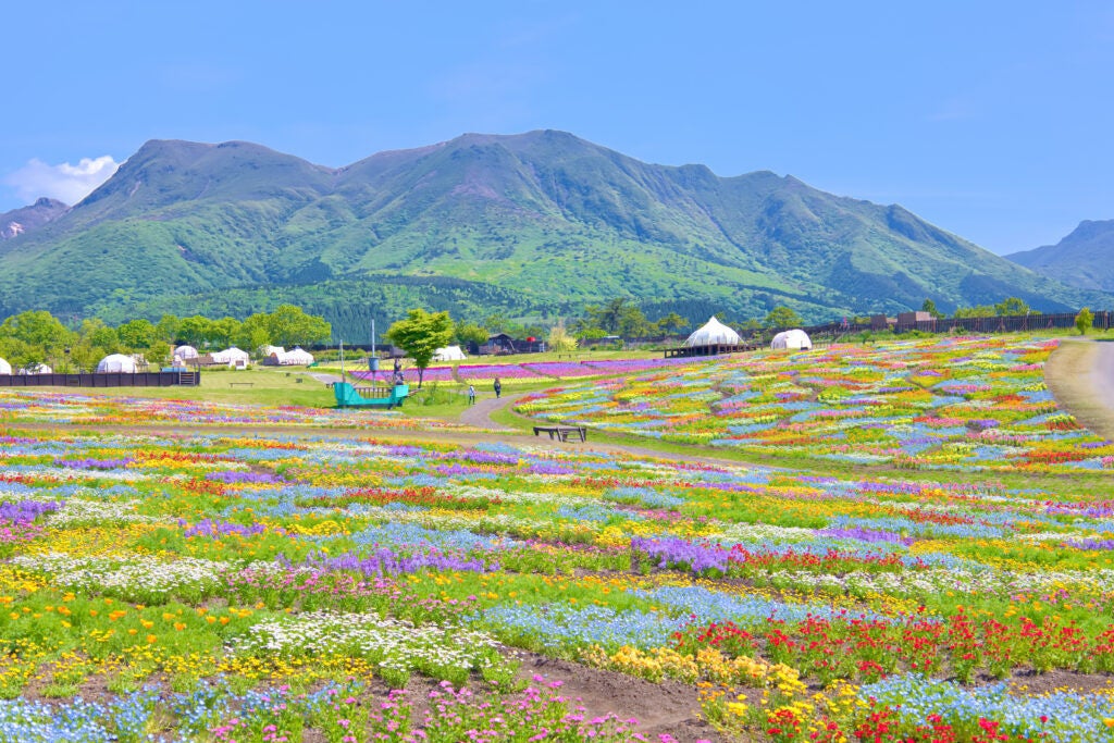阿蘇国立公園内の久住高原に位置し、日本百名山のくじゅう連山や遠くに阿蘇五岳を背景とした美しい自然が満喫できる花公園です。約22万㎡のくじゅう花公園内には、春から秋にかけて約500種、500万本の花々が咲き誇ります。園内は森のエリアや花畑エリア、野草のエリアなど変化にとんだ景色を楽しむことができ、癒しと潤いを体感していただけます。