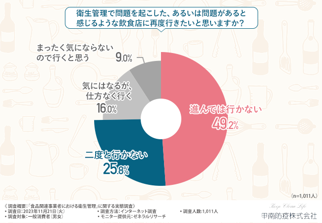 「衛生管理で問題を起こした、あるいは問題があると感じるような飲食店に再度行きたいと思いますか?」と質問したところ、『進んでは行かない(49.2%)』『二度と行かない(25.8%)』『気にはなるが、仕方なく行く(16.0%)』『まったく気にならないので行くと思う(9.0%)』という回答結果になりました。