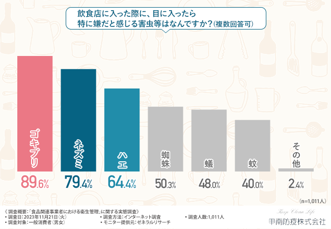 そこで、「飲食店に入った際に、目に入ったら特に嫌だと感じる害虫等は何ですか(複数回答)」と質問したところ、『ゴキブリ(89.6%)』と回答した方が最も多く、次いで『ネズミ(79.4%)』『ハエ(64.4%)』と続きました。