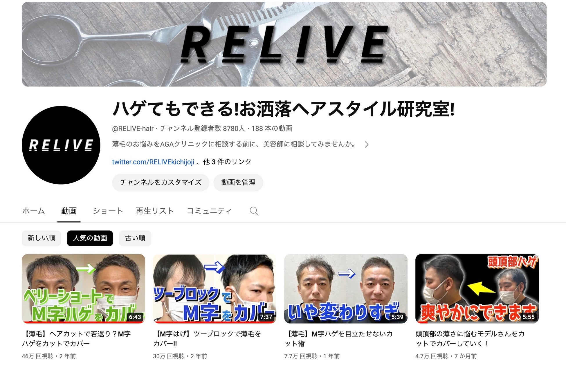 RELIVEの公式YouTubeチャンネル「ハゲてもできる!お洒落ヘアスタイル研究室!」にて、薄毛の方に向けたカットやスタイリングのテクニックを紹介しています。ぜひご覧ください。