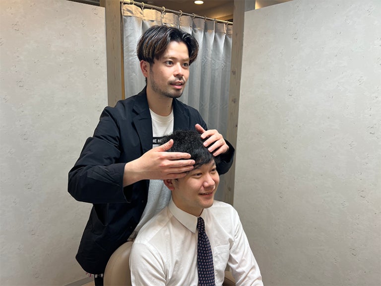 「完全個室」のプライベート空間で、薄毛の男性のヘアデザインに特化した専門のスタッフがカウンセリング、カット、スタイリングを行います。施術後は専用のツールを使って仕上がり写真を共有し、ご自宅での再現性をアップします。