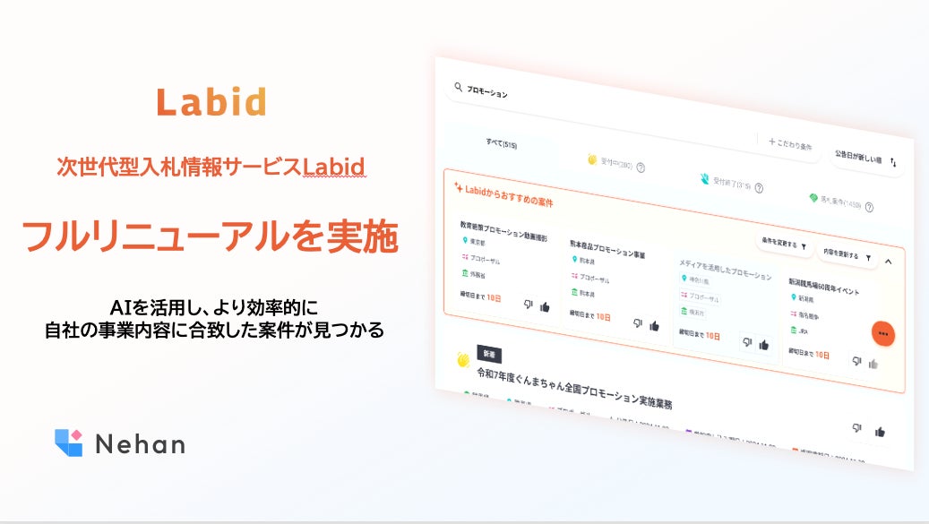 Nehan株式会社(代表取締役:鶴巻百門、木嶋諄、以下Nehan)は、2025年2月1日、次世代型入札情報サービス『Labid』のフルリニューアルを実施し、提供を開始したことをお知らせします。