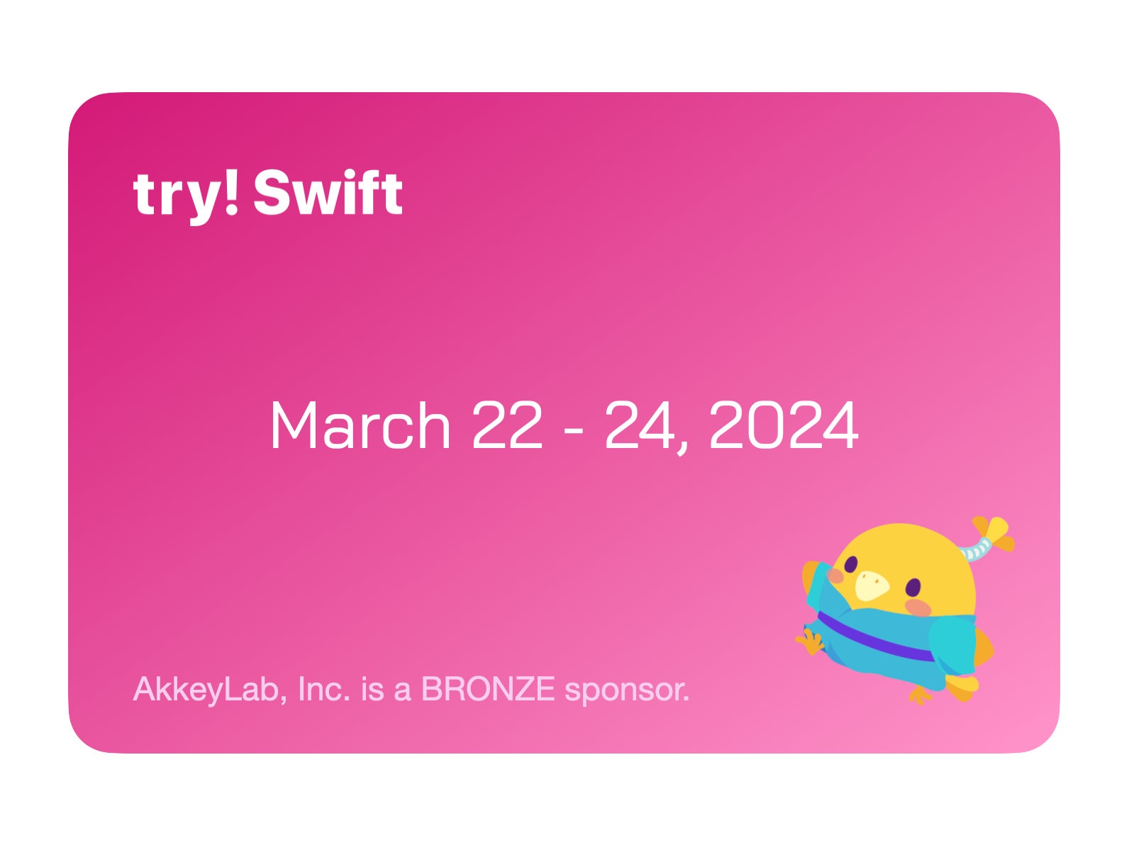 AkkeyLab株式会社(本社:東京都渋谷区、代表:板谷晃良)は、iOSアプリやmacOSアプリ、Swift on Server、SwiftWASMなど、プログラミング言語「Swift」に関する知識を共有するための国際カンファレンス「try! Swift Tokyo 2024」に、BRONZEスポンサーとして協賛することをお知らせいたします。カンファレンスは、ベルサール渋谷ファーストにて2024年3月22日(金)から3月24日(日)の3日間開催されます。