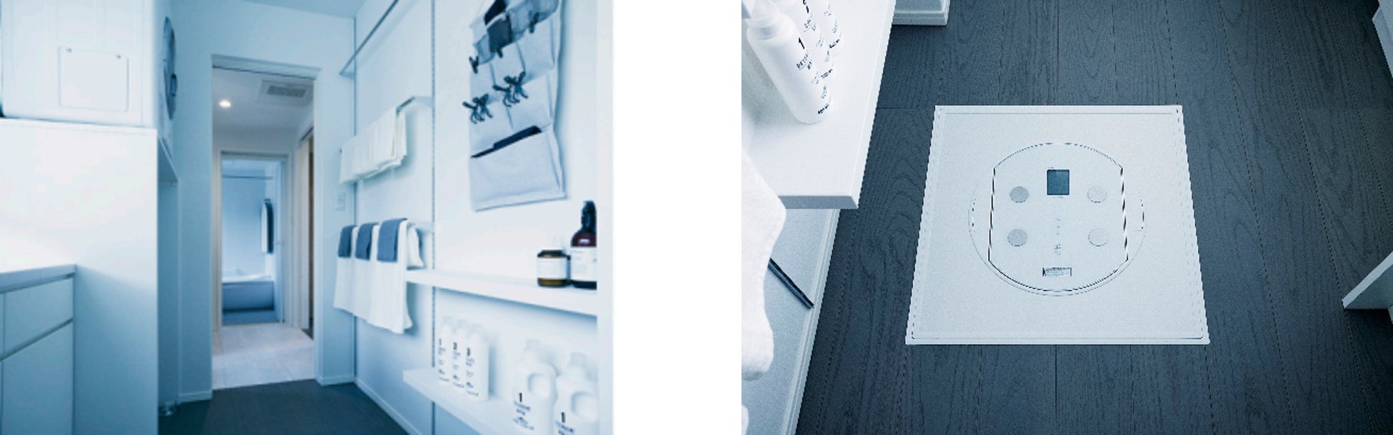 床下収納と一体化した体組成計を脱衣所に設置。常に目に入る生活動線上にあるため、毎日の健康チェックを習慣化することができます。また、乗るだけの手軽さで体重・体脂肪率はもちろん、筋肉量や内臓脂肪レベルなど10項目の計測が可能です。従来の体組成軽は、出しっぱなしで掃除の邪魔になりがちですが床と一体化しているため掃除の時もストレスフリー。