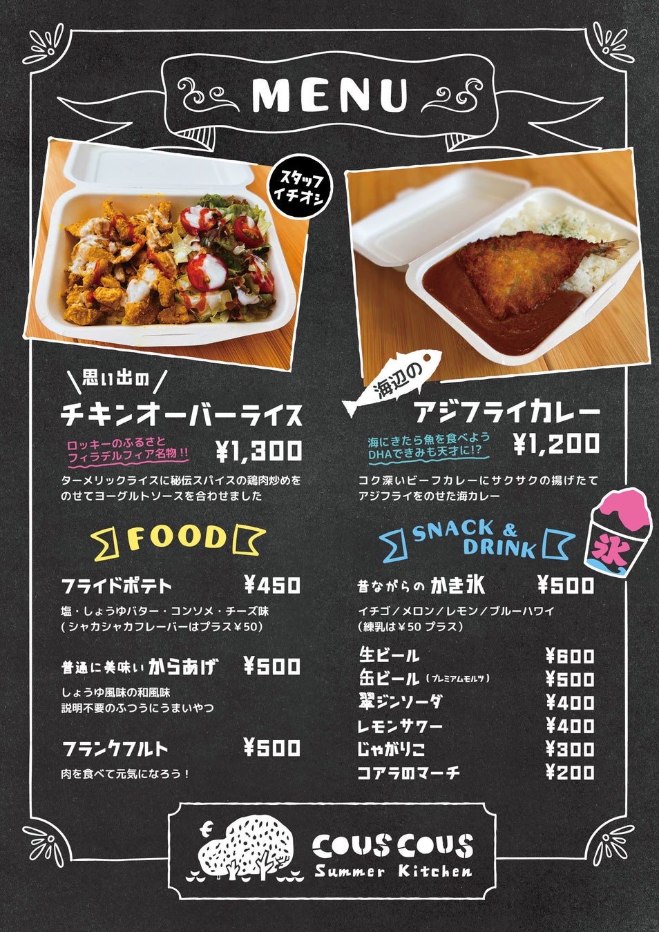 また、クスクスグランピング真鶴では、真鶴ウォーターパークに出店するキッチンカーをお手伝いします。キッチンカーでは、チキンオーバーライスやアジフライカレーなど、腕によりをかけたオリジナルメニューをご用意しております。