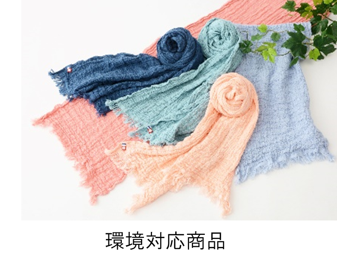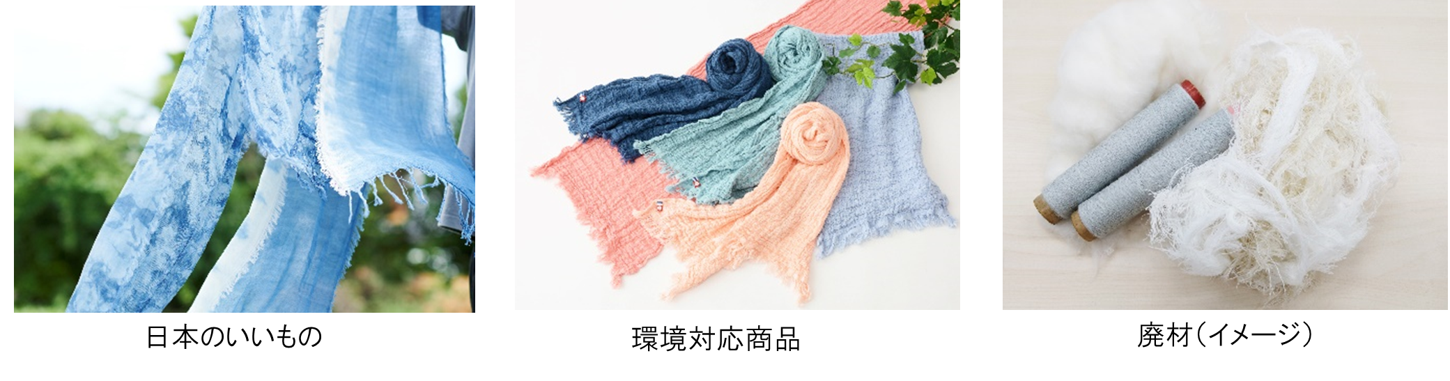 当社初出展となる本展示会では、日本の伝統染色で染めた一点物のストールや、工場で廃棄していた裁断くずをリサイクルしたエコ商品の展示に加え、通常の糸とリサイクル糸で織った2種類の生地を触って感触を試していただく比較展示も行います。当社は、失われつつある素晴らしい日本の伝統文化をふたたび暮らしに取り入れたいと考え、5年前より商品開発を進めています。また、生地の端切れや余った糸からリサイクルした「再生糸」を使った環境に優しい商品にも力を入れ、資源ロス削減の一助となるよう取り組んでいます。