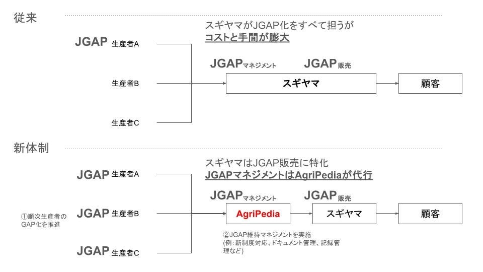 そこでJGAP団体認証を持ち、予てより農業のDXを押し進めてきたAgriPediaが間に入る事で農家の生産方法や労働環境などを管理し、GAP認証を得た野菜をスギヤマに収めるシステムを構築しました。これにより、スギヤマが各取引先のGAPマネジメントをする必要がなくなり、農家もコストを抑えてJGAP認証を取得することが可能になるのです。