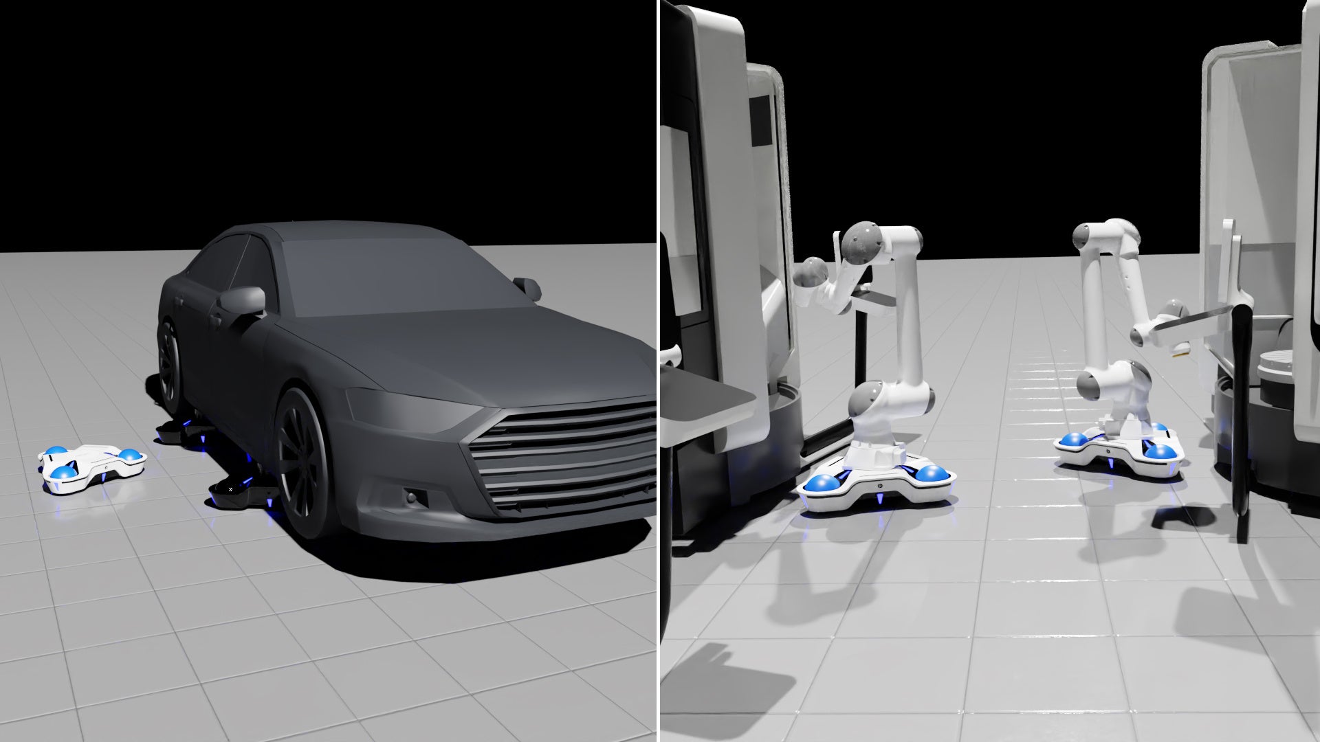 <左> 協調制御による重量物の分散支持 <右>協調作業によるタスクの効率化