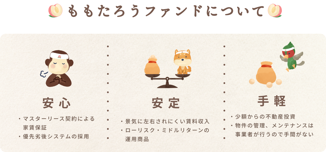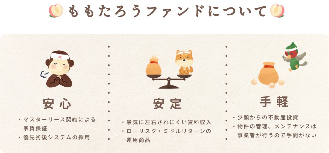 ももたろうファンド3号では、優先劣後での投資家保護に加え、資産管理会社と弊社でマスターリース契約をします。これにより賃料収入が保証され投資家様のリスクを軽減します。