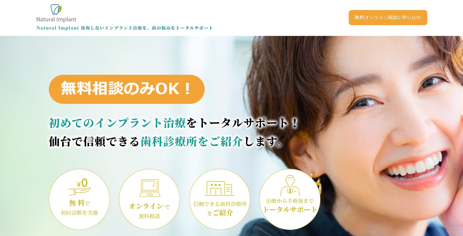 「Natural Implant(ナチュラルインプラント)」は、インプラント治療の情報提供からオンライン相談、歯科クリニックのご紹介、アフターケアまで、インプラント治療のサポートを一気通貫で患者様に伴走しながらポートを行っていくサービスです。