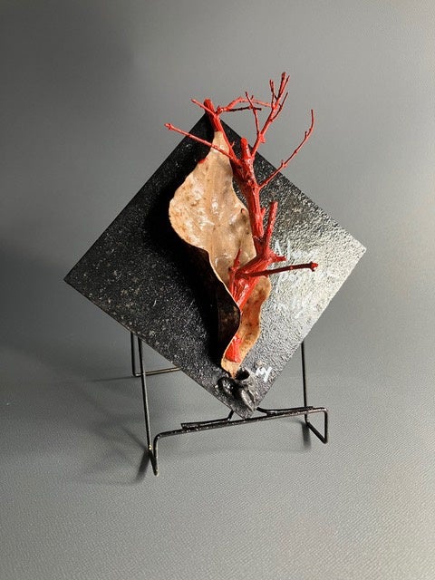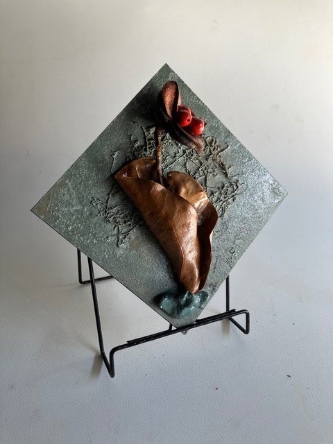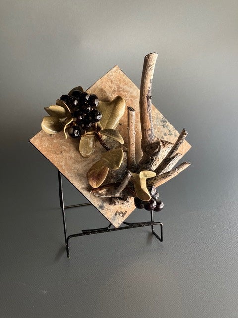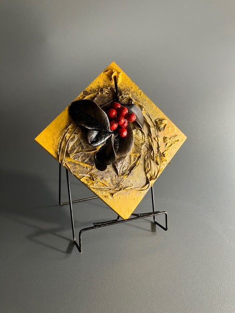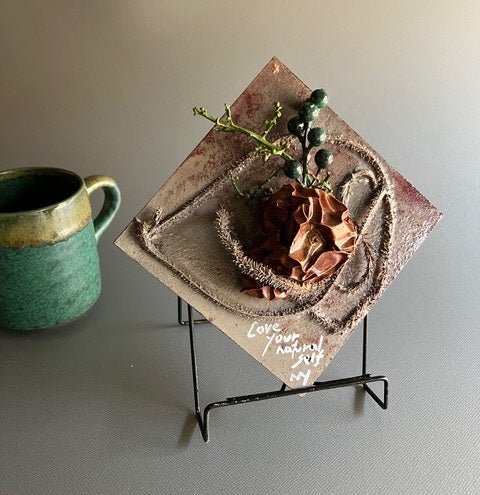 変貌オブジェとは、拾い集めた枯れ木や実、枯れ葉を板に並べ、そこから受けるインスピレーションをもとにペインティングを施した作品です。一度枯れてしまった植物を再び変貌させ、アートとして蘇らせています。