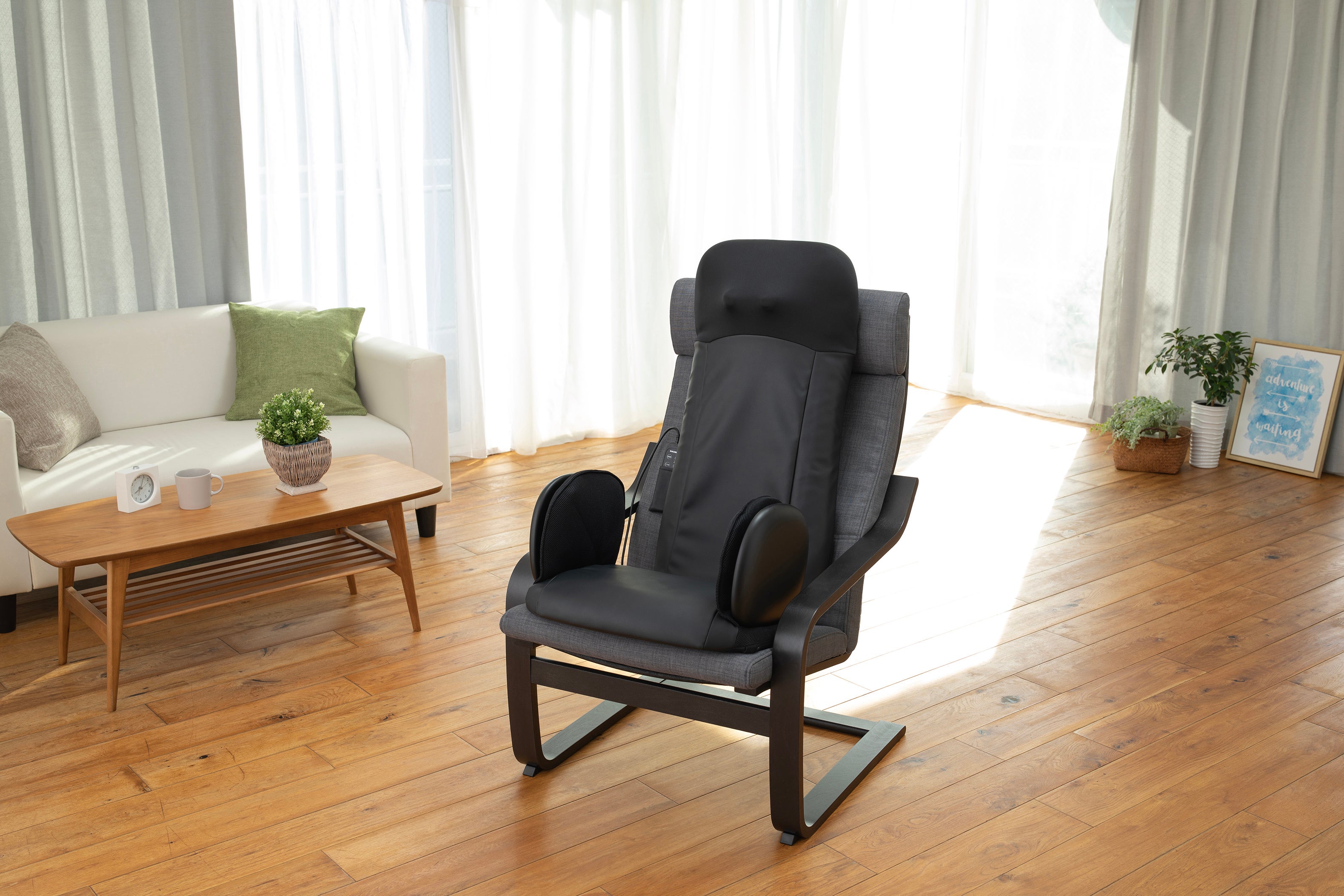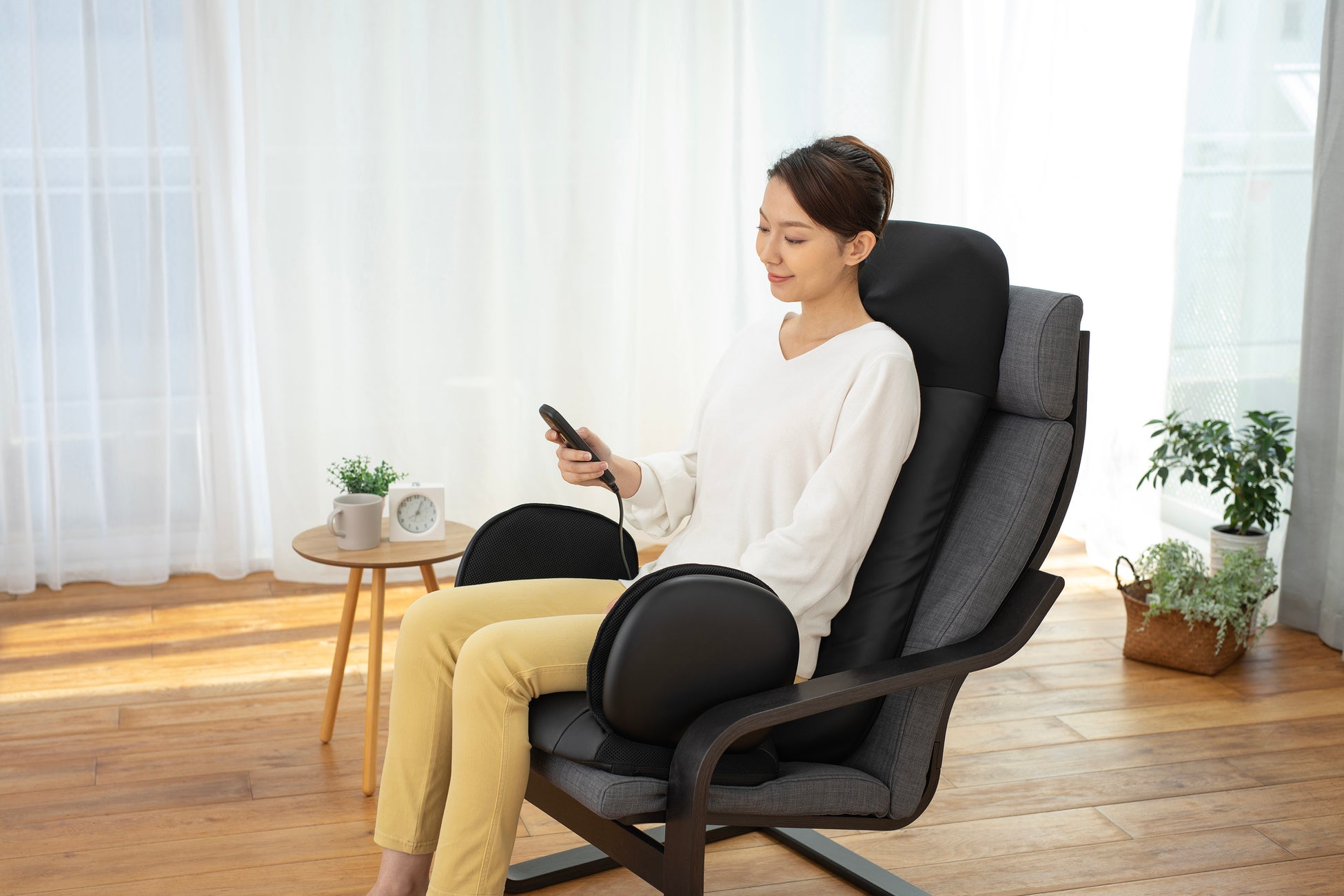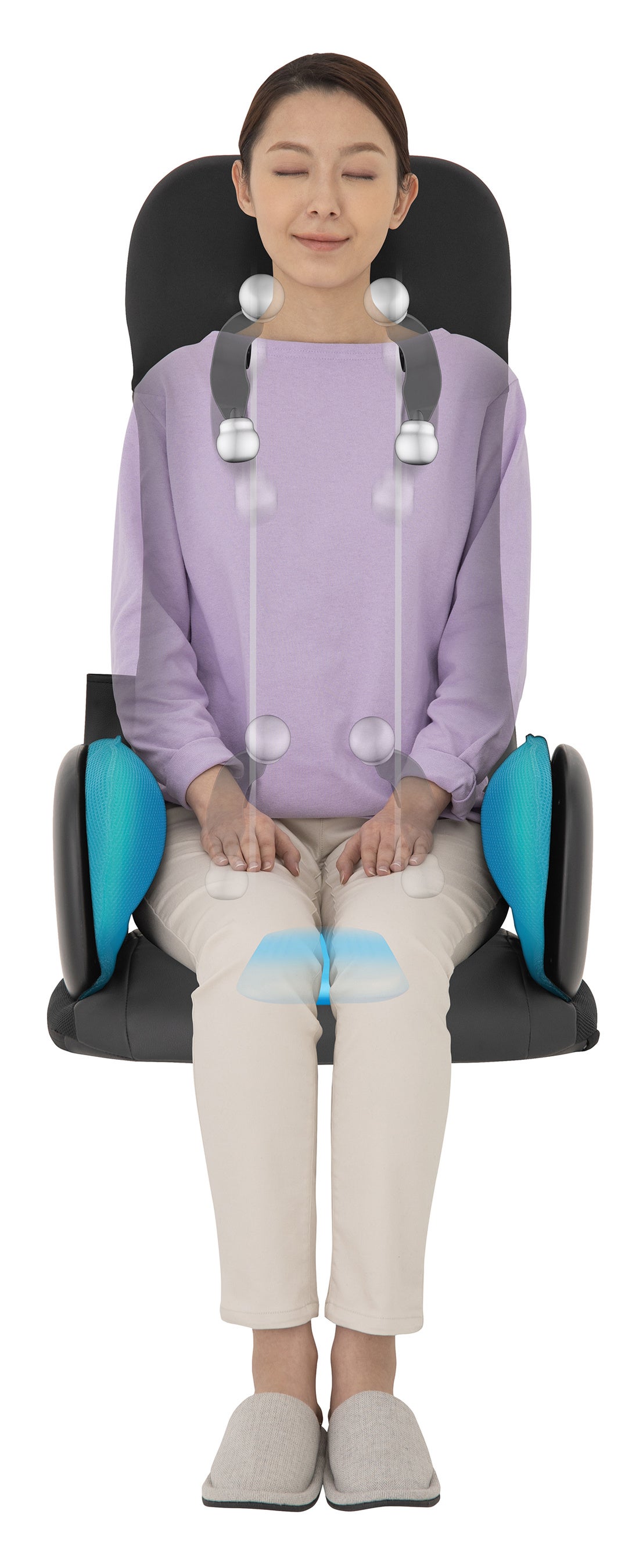 親指で、じっくりと「こねる」ような手もみ感覚を実現した「横回転モミ玉」で首・肩をはじめとする、背すじ全体をマッサージ。エアーバックで太ももや骨盤周り、また、おしりまでもマッサージしてくれる優れものです