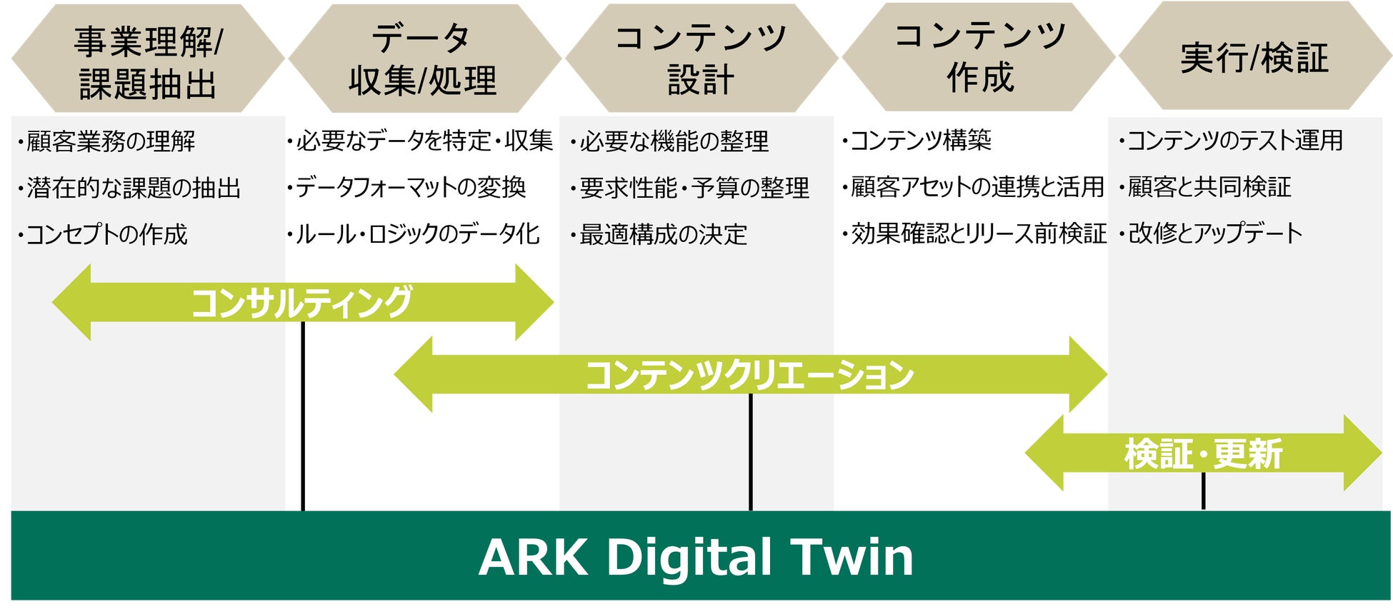 ARKデジタルツインプラットフォームは、課題発見からコンテンツ作成までの工程を対応していることから、要望に合わせたソリューションを提供できます。