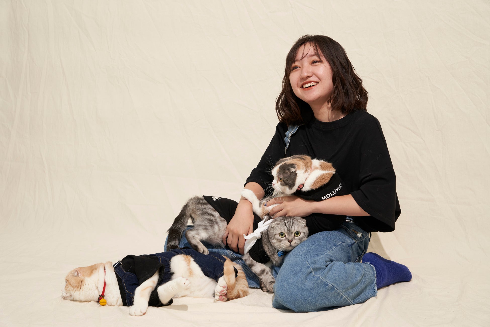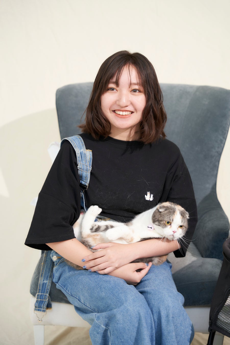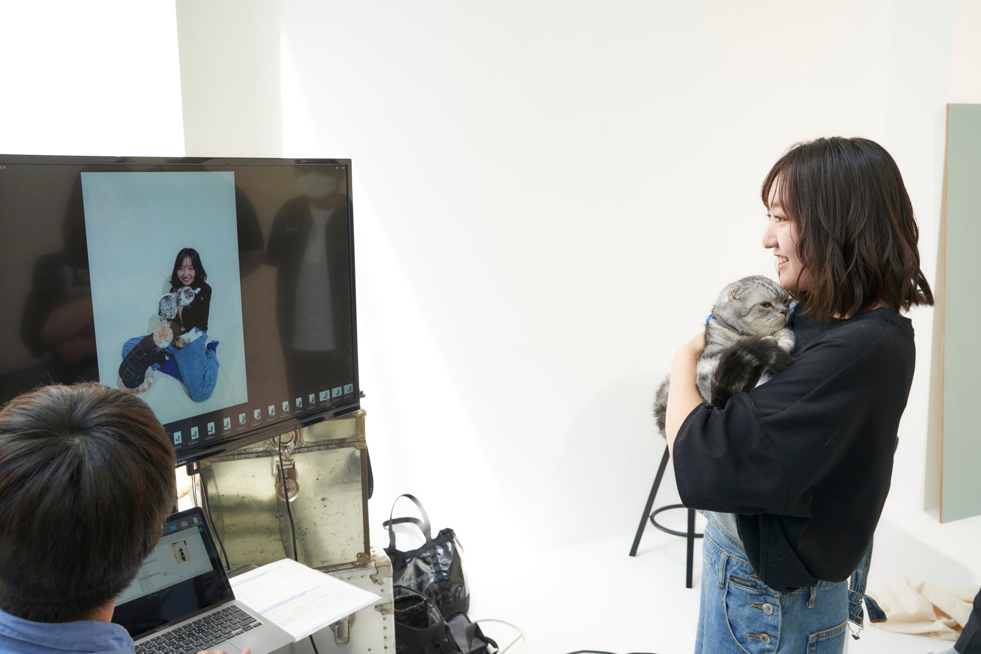まず、『HAREI』 トップヘアメイクの大上 絵理奈氏が花音さんのヘアを担当。その後、衣装選びへ。花音さんは愛猫とお揃いで、デニム生地のオーバーオールと犬猫のロゴが入った黒色のTシャツを身にまとい、満面の笑みを見せていました。