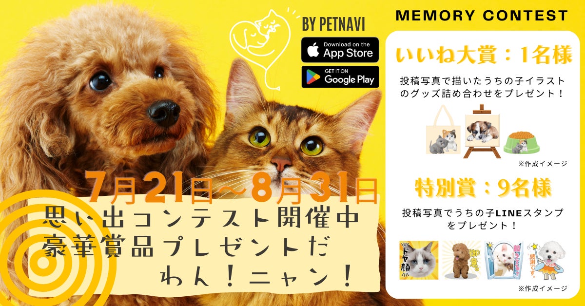 ペトナビは、7 月21 日から8 月31 日まで「私とペットの思い出コンテスト」を開催します!投稿された、ワンちゃん、猫ちゃんの写真の中から、最も「いいね」を集めた投稿者とペトナビ特別受賞者の合計10名に、うちの子イラストグッズやLINEスタンプを贈呈します。