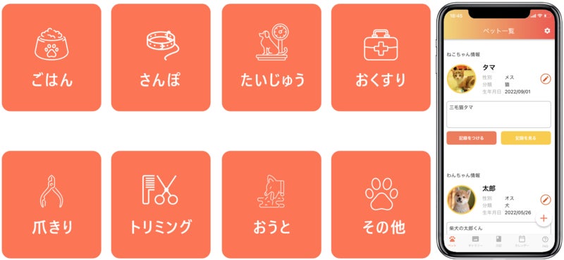 ご飯・散歩・体重・お薬・爪きり・トリミング・おうとなどの基本的なペットのお世話に関わる記録を簡単にとることができます。