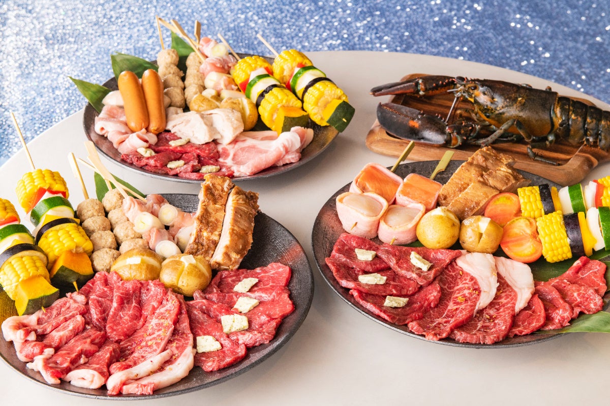 屋外の緑鮮やかな木立に囲まれたリゾート感あふれるプールサイド・レストランが夏季限定でオープン。宿泊者だけでなく、レストランのみの利用も可能なので、手ぶらで気軽にバーベキューをお楽しみいただけます。ハーブガーリックでマリネしたポークベリーや、低温調理した鶏もも肉、国産牛、カラフルな野菜串が入った「ポーク、チキン、ビーフのバラエティーセット」や、トウガラシやみすじなど上質な国産牛の希少な部位をたっぷりと味わえる「こだわりの国産牛セット」、活オマール海老や帆立貝などのシーフードと、厳選したお肉を堪能いただく「国産牛と贅沢シーフードセット」をご用意します。また、12歳までのお子様がご注文いただけるキッズバーベキュープレートも新登場。すべてのバーベキューセットには、サラダバー、ご飯、味噌汁、ソフトクリーム、ソフトドリンク(約20種類)など、各種ビュッフェが含まれます。お飲みものは、スパークリングワインや生ビール、カクテルを揃えた飲み放題プランや、オレンジやレモンをまるごと搾ったフルーツソーダドリンク、リゾート気分が味わえる3種類のオリジナルカクテル(ピニャコラーダ、マイタイ、ブルー・ハワイ)もご用意いたしました。刻々と変化する夕暮れ時の空を見上げながら、気の合う仲間や家族と一緒に、ホテルで楽しむ優雅なバーベキューをお楽しみください。