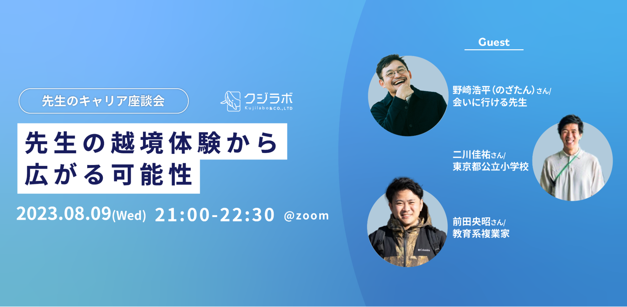 先生のキャリア支援を行うクジラボでは、先生も「越境学習」を経験することで、今後のキャリアがより豊かなものになると考えています。そこで今回、「越境体験から広がる先生の可能性」をテーマにした先生のキャリア座談会を開催することになりました。