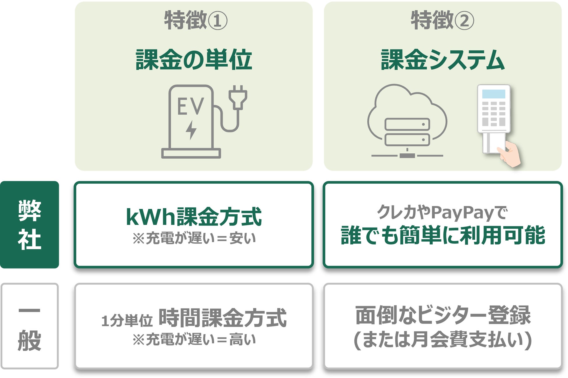この新製品の最大の特徴は、充電のために消費した電力量である「kWh単位の従量課金方式」であることです。現在の日本で一般的な「時間単位の課金方式」は、次のような課題があります。