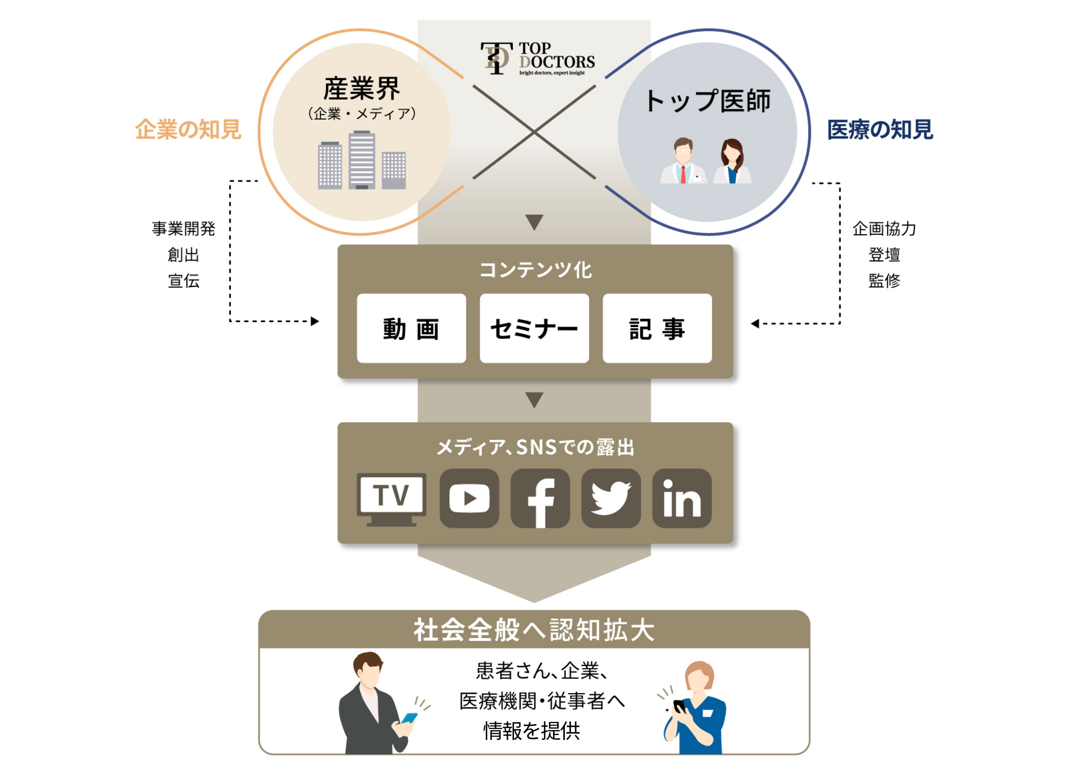 「TOP DOCTORS(トップドクターズ)」では、その関係性を活かし、医療の知見を産業界とつなげる取り組みを通じて、医療のみならず社会によりよい情報の発信と共有を行う事業を展開してまいります。