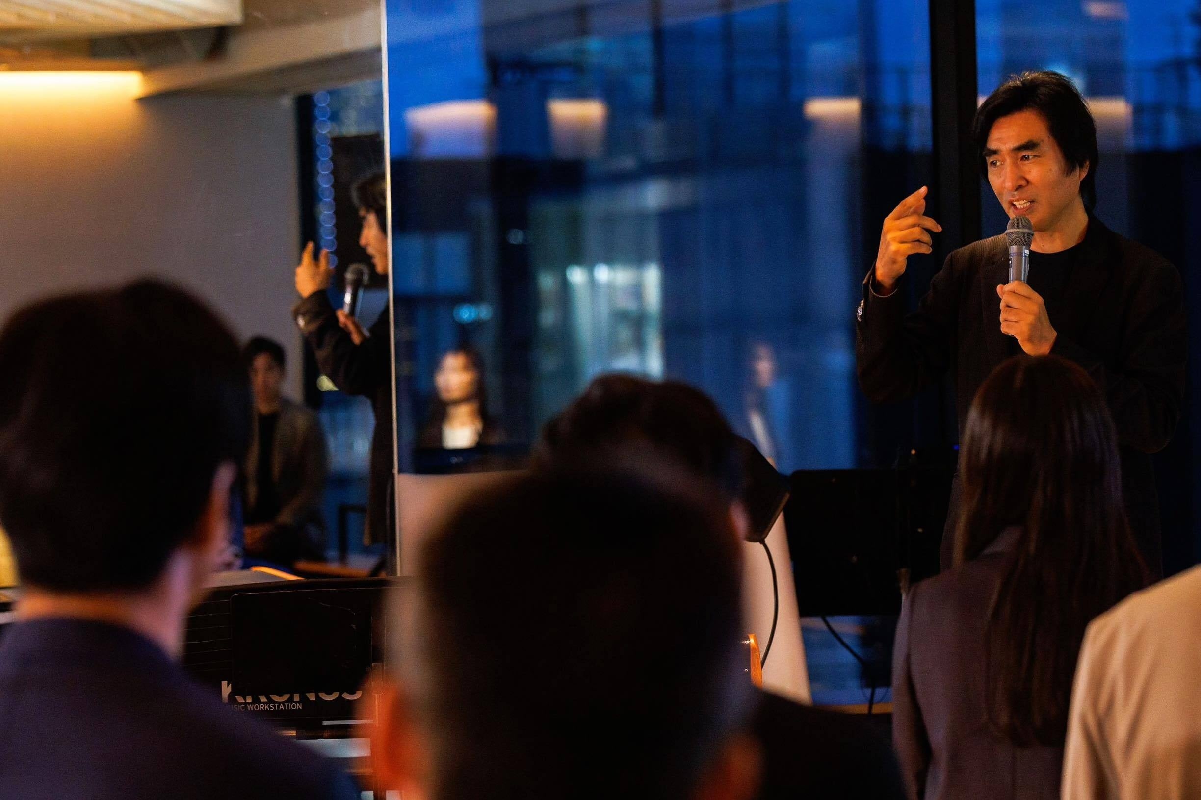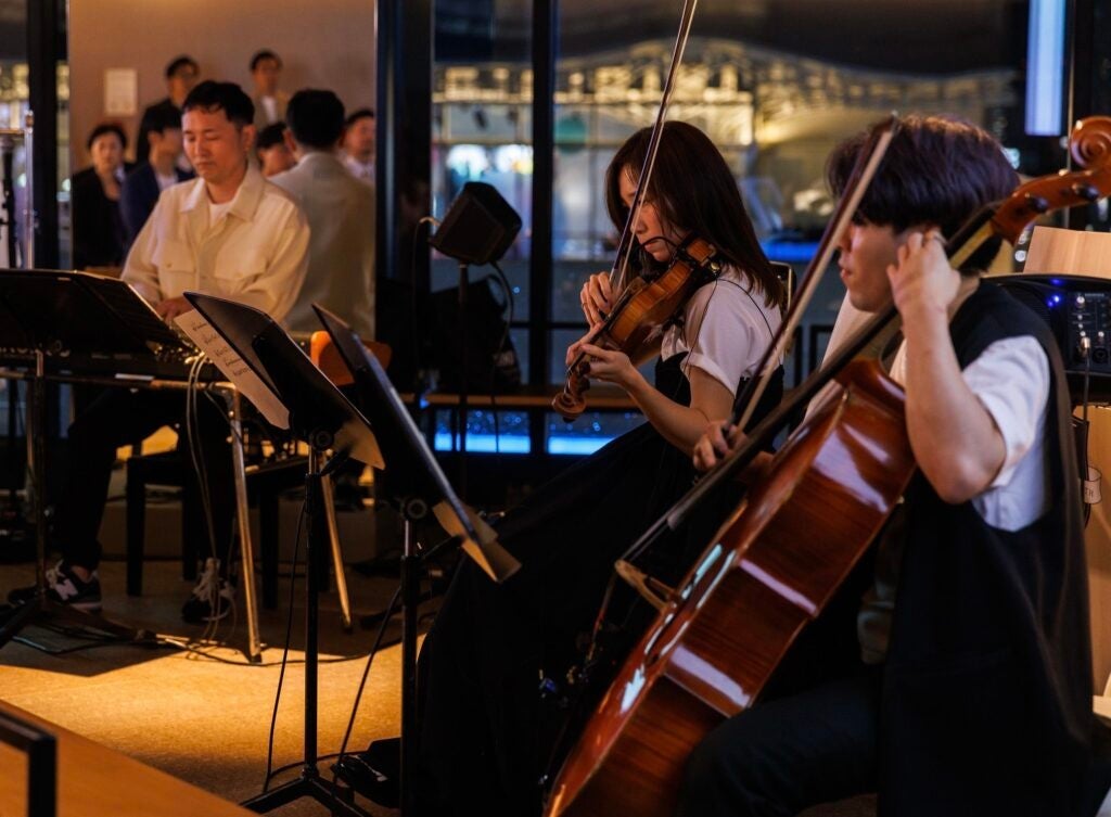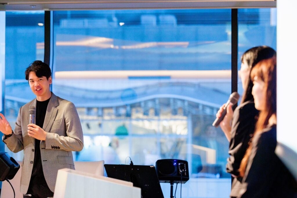 Jazztronik 野崎良太様と、バイオリニスト伊藤綾様、チェリスト飯島奏人様による生演奏を披露していただきました。ご演奏頂いたのは、普遍的でありながらスタイリッシュで美しい「Caravan」「blackforest」の2曲。10分ほどのステージながら、素敵な夜景を背景に素晴らしい演奏に包まれ、ゲストの皆さんも非常に喜んでくださいました。